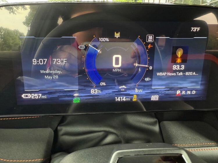 The other thing I liked is when you get in the driver’s seat with the key in your pocket or purse and put your foot on the brake, the vehicle comes on by itself. This was weird at first, but then I grew to really like the fact there was no start button. Being electric there is no sound, but the entire huge screen comes alive. When you put it in park, let your foot off the brake, and open a door it turns itself off or there is a button on the screen to manually turn the vehicle off. This was a really neat feature and cuts out the step of hitting a start button every time you get in or out of the SUV.