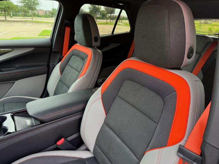 Inside the Blazer SS it has Evotex (man-made leather) & Suede two-tone seats in dark and light gray with orange accents on the seats and throughout the cabin.