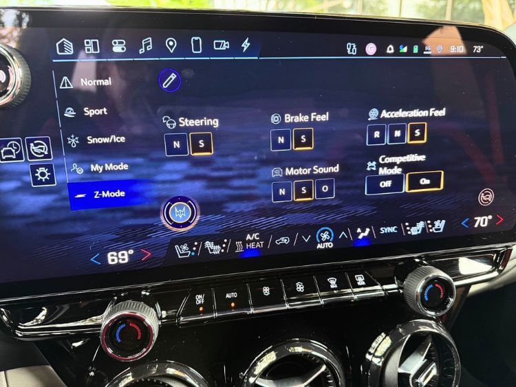 Also from the screen, you can choose drive modes including normal, sport, snow/ice, My Mode, and Z Mode, which is my favorite. Z Mode is an exclusive drive mode designed to enhance a dynamic driving experience. This mode allows you to customize various vehicle parameters, including acceleration response, steering sensitivity, brake feel, and electric motor sound. Additionally, Z Mode offers a "Competitive Mode," which adjusts the vehicle's stability and traction control systems to provide a more engaging driving experience, particularly suited for track conditions. This mode is designed to be user-friendly, ensuring that drivers can easily tailor the vehicle's performance characteristics to their preferences.