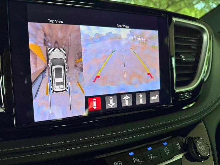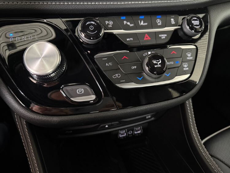 High on the center stack is the terrific 10.1” Uconnect 5 navigation screen. It operates the 19-speaker Harmon Kardon sound system that has a subwoofer, the navigation system, the Bluetooth, wireless Apple CarPlay and Android Auto, a wireless charger, Wi-Fi hotspot, universal garage door opener, and check out the FamCam that checks on rear occupants. There are a host of apps that provide real-time information. Below the screen are controls for the parking systems and the air conditioning systems.