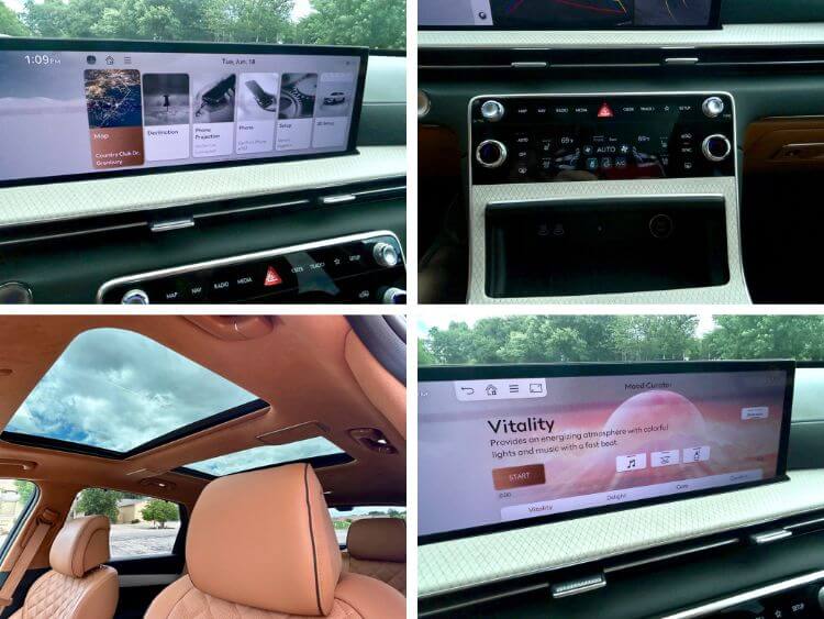 Click on the Mood Curator option and this feature offers four different modes: vitality, delight, care, and comfort, all of which offer different settings and distinctive treatments. Genesis provides three fragrance choices to buyers. Once activated, the system lifts the window shades, plays distinctive background music through the Bang & Olufsen premium surround audio system, turns on the LED ambient lighting, and sprays the aroma. In the Care and Comfort mode, the Mood Curator then activates the massage seats and reclines the seats to simulate the type of treatment available in a lounge. You forget you are actually in a vehicle. Of course, if driving, many of the cool features are inoperable.