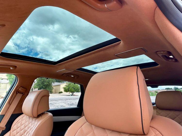 There are no options except the paint, so you get the Nappa leather seats, Alcantara headliner, a power panoramic moon roof, a heated armrest, adaptive cruise control, highway driving assist (self-driving), a rearview camera mirror, and one of my favorite features, soft-closing doors.