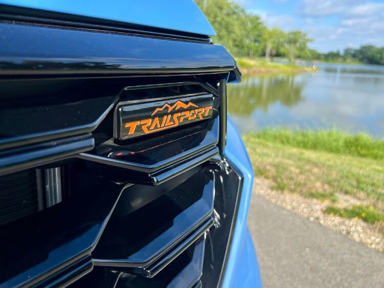 My test vehicle's Diffused Sky Blue Pearl hue compliments it exclusive 18-inch Shark Gray Alloys with TrailSport logo and Black Lug Nuts that hug all-season tires. TrailSport is the only trim equipped with underbody skid plates and front/rear recovery points. Orange TrailSport badging shows off its status on the front and rear.