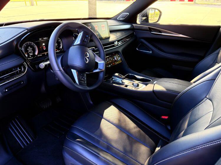 Here’s the big change for 2025, and it’s under the sculpted hood: Gone is the V6 we’ve come to know and love, and it is replaced by a 2.0-liter inline 4-cylinder equipped with a VC-turbocharger. The VC-Turbo can automatically adjust its compression ratio based on driving conditions and accelerator input, which allows it to balance performance and efficiency. The system is designed to be more fuel-efficient and powerful than non-VC engines. It also has greater towing power, with the 2025 QX60 having a standard towing rating of 6,000 pounds, which is impressive. It is mated to a 9-speed non-CVT regular automatic with shift paddles, and my test vehicle comes with all-wheel drive.