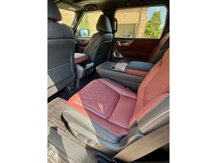 Second row occupants are going to be really happy campers. The second row captain’s chairs are very comfortable. Get this: In a segment-first, the QX80 has Biometric Cooling technology that works with the Tri-Zone Climate Control System to monitor each passenger’s individual temperature, adjusting automatically for optimal comfort. The two captain chairs are heated and cooled, they are power-adjusting, and they recline. There is another screen back there, on top of the big center console to control the seats, and rear passengers control their own temperature, they have USB-C ports and a 12-volt charging outlet. People in back will want for nothing.