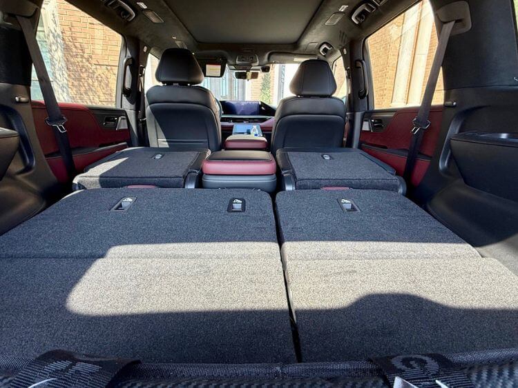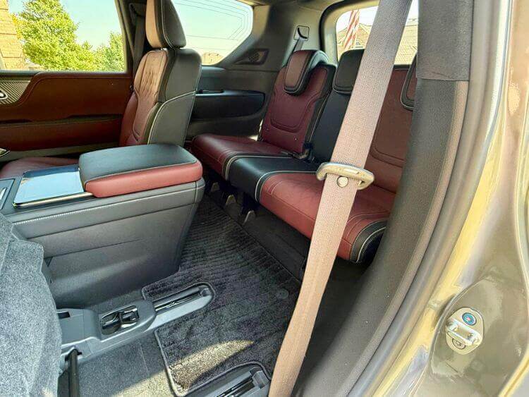 Second row captain’s chairs slide electronically to make it simple to get to the third row. Once seated, there is room for two good-sized adults, or three kiddos, there are USBs for them, there are air vents in the ceiling, the 3rd row seat power reclines, and in a rarity, it is also heated! Leg and headroom are exceptional.