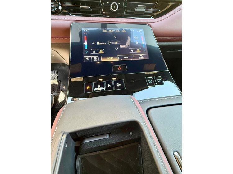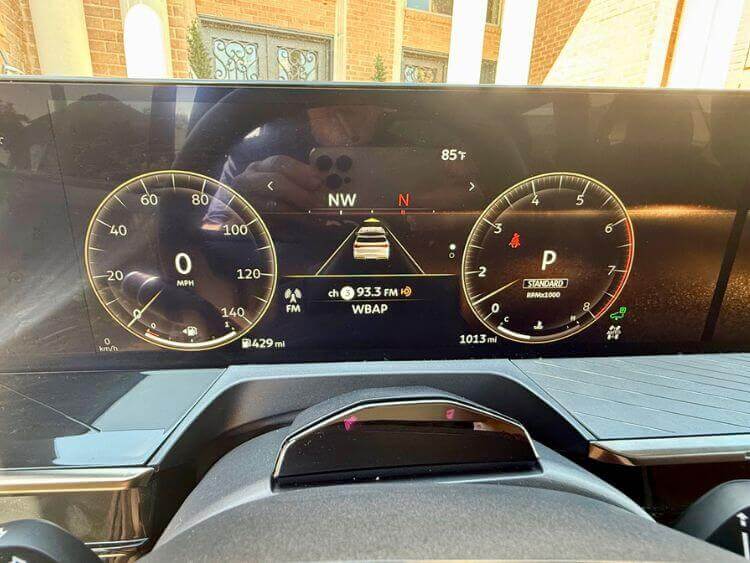 28” of screens not enough across the dash ? NO WORRIES. There is another 9” touchscreen that is part of the center console that operates the climate control system, and the heated and cooled seats. It is simple to operate and not distracting. Just below that are PRND buttons. They look great and make it simple to go from park, to reverse or neutral, and if you hit the drive button twice, you can shift the QX from the steering wheel paddles. To the right of the tranny buttons is one button to raise and lower the entire vehicle, and another to activate the surround-view cameras. By the way, this steering wheel is beautiful, has a ton of detail, is flat-bottomed, and feels really great in your hands. Oh, it’s heated and power tilting and telescoping, of course.