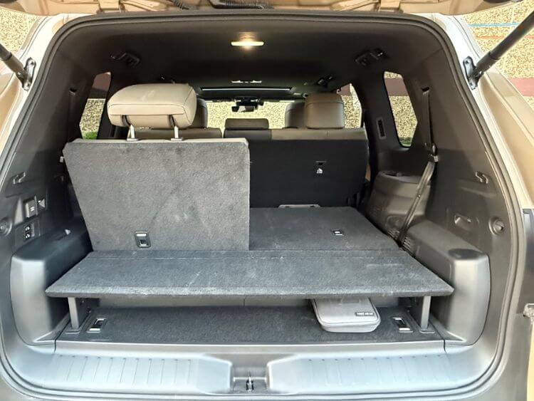 The cargo area has a bit of a weird shelf to it, but you can store things under it, and the seats do fold flat on top of it. Still, you only get 7.2-cubic feet of cargo with the back seat up, but if you lower the third row, it grows to a respectable 31-cubic feet. The third row folds up and down with a power button, but you have to hold it to get them all the way up or down, which is a little annoying. In the rear is a 2400-watt AC power inverter positioned under the center console, allowing for an external power supply to give power to anything you wish.
