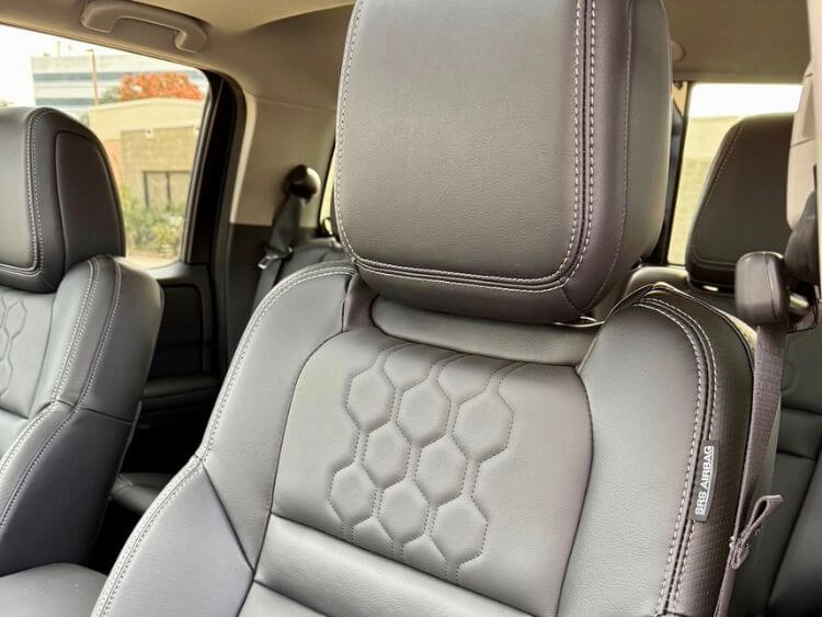 Moving to the interior, it was surprisingly nice with soft-touch materials throughout the cabin. NASA-designed zero-gravity leather seats are super comfortable, heated, and the driver gets power controls, including power lumbar settings. The seats are stitched, and stitching runs across the dash as well.