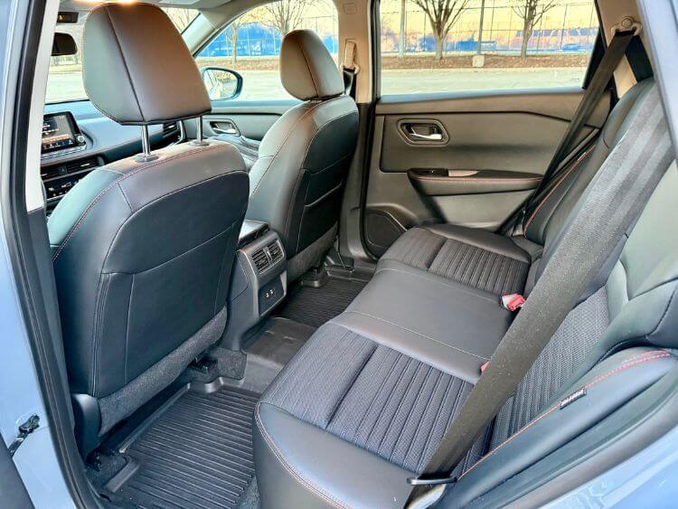 The back seats split in a 60/40 configuration. One thing jumped out at me when I opened the back doors was how wide the opening is. The doors open to almost 90-degrees, and entry height is high, too. That means entry and exit out of the Rogue back seat is easy, as is putting a car seat in. Very well thought out Nissan!