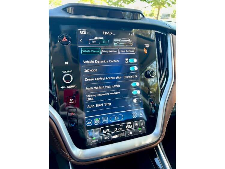 Also from the screen you can turn off the start/stop system, change the car’s settings, activate the automatic brake hold, change the vehicle Dynamic controls, and activate X mode that works with the Subaru All-Wheel Drive system to provide drivers with increased performance when needed most. This driver-activated enhancement is designed to be used when road conditions become particularly treacherous or challenging, such as in slippery or icy weather, on steep hills, in muddy terrain, or even when just taking the car off-road.