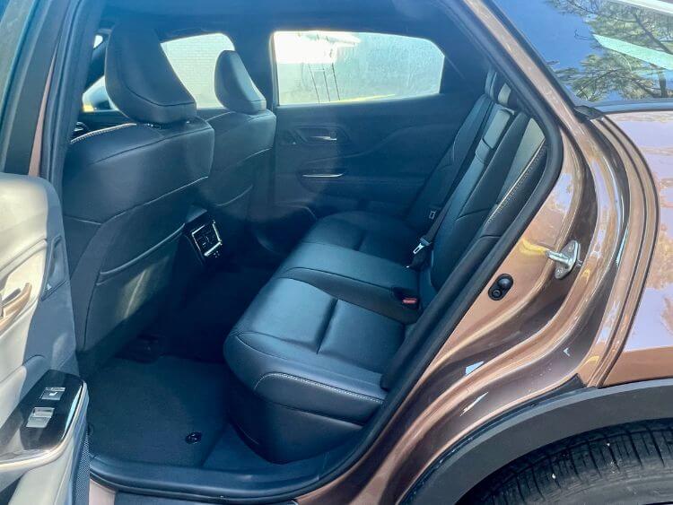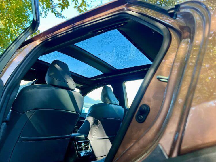 The second row is a tale of two stories. Great on legroom but not so great on headroom due to its sloped roof design and stadium seating. It's not overall very practical. The middle seat is also an issue for those over 5'5" inches tall. Passengers enjoy heated seats, A/C vents, 2 USB-C ports and a cushiony drop down armrest with cupholders. While there's not a lot of window real estate back here due to tall door panels, a large fixed panoramic glass roof lightens up the interior.