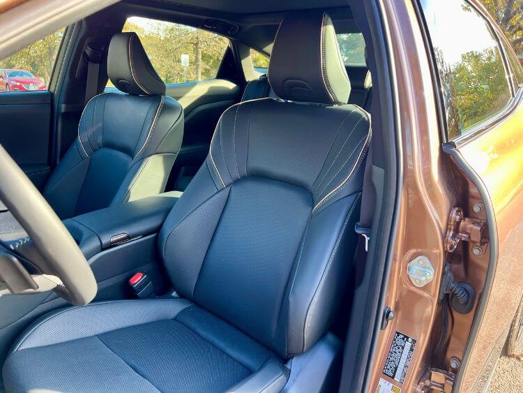 The Crown's mostly black interior is nice, but it's not the most exciting cabin ever. It did gain some upgrades in 2024, but I'm still looking for a bit more interest. Though I have to say the white contrast stitching and piping on the 8-way power leather-trimmed front seats is well-done. The front seats, both three-level heated and ventilated, are comfortable with cushiony side bolsters. A nicely heated, leather-wrapped steering wheel is equipped with paddle shifters thanks to the Platinum-only Hybrid max powertrain.