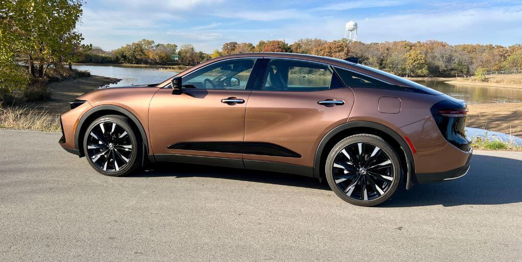 With its fastback shape, the Crown's bold design is so different from the rest of Toyota's sedan lineup that its Toyota badging is likely to be a surprise. My test vehicle's exclusive-to-the- Platinum Bronze Age and Black two-tone exterior paint is rather striking paired with 21-inch 10-spoke machined alloy wheels.