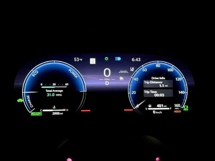 Hit the start button to illuminate a 12.3” gauge cluster that you can configure and gives you all sorts of useful information. Everything is colorful and easy read. There is a large gauge on the left side to tell you about battery usage and fuel consumption. If you can stay inside the Eco area, you are maximizing fuel economy.