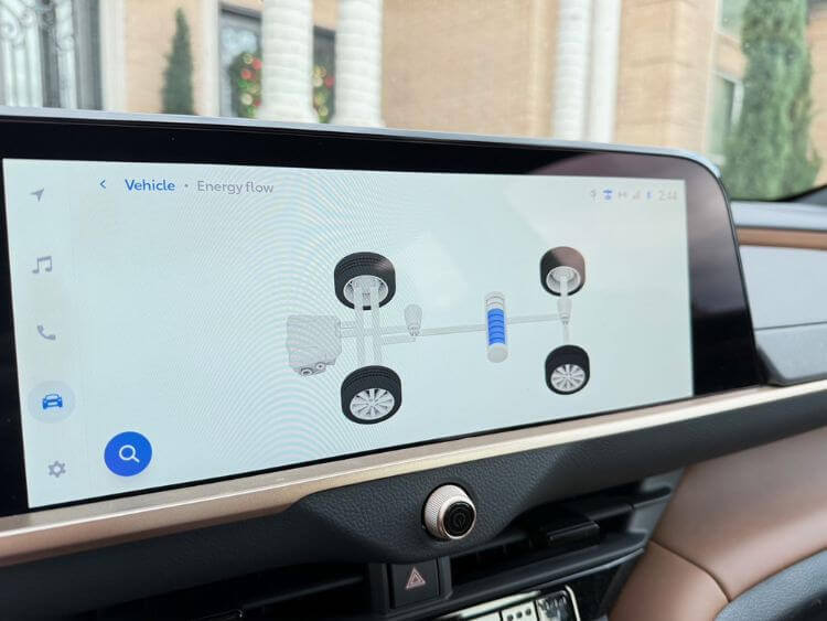 Mid-dash is another 12.3” multi-media touchscreen that houses the 11-speaker JBL audio, navigation system, wireless Apple CarPlay and Android Auto, settings, and a cool screen to show you the energy flow. There is a Wi-Fi hot spot, and SiriusXM as well. There is a fairly large standalone knob for your volume, and you can control it from the heated steering wheel also.
