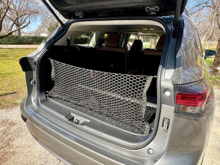 You'll open up the hands-free liftgate to a well-equipped cargo area. It's ready for anything with a nice cargo liner and mesh cargo holder. It's one of those nice features that you don't realize you need until you have it. It also has a cargo tonneau cover to hide things.