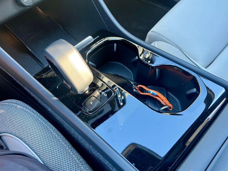 Smartphone charging is located just under the center stack. I wasn't in love with the charging pad material as it scuffed easily. A slim center console houses a sculpted gear shift knob and two cupholders. The glossy black trim does tend to attract lint and such. The center console bin is on the small side.
