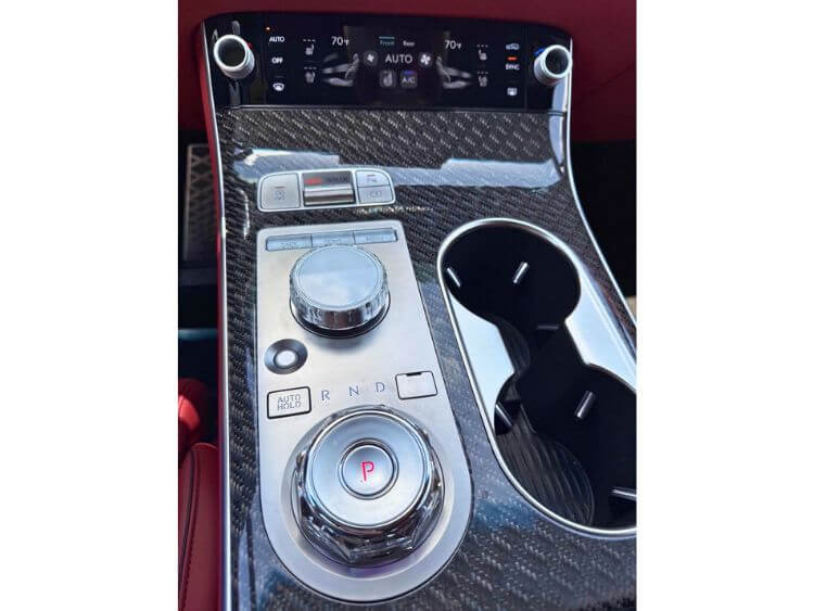 The center console houses a rotary shifter as well as drive modes featuring snow, eco, comfort, sport mode, sport+, and you can mix and match in the My mode. There is an auto hold button which is a feature I truly love. Also on the console is a button to turn off the start/stop, choose your camera views, activate the self-parking feature, and another button to lock-in the all-wheel drive. There is a wireless cell charger, and USB and USB-C ports. Above that are all the climate control settings with actual knobs.