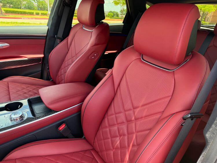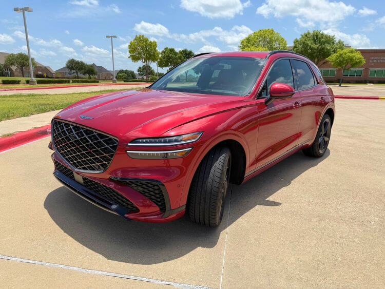 I love the exterior looks of this SUV. The 21” alloy wheels look fantastic, the restyled grill, a large spoiler that should have the rear wiper tucked it, and this color is fantastic. It is called Mauna Red and it really pops. The GV70 is sleek and sporty and will turn a lot of heads.