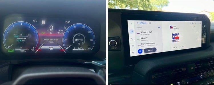 Moving over to the center dash of the Land Cruiser, there is a large 12.3” infotainment screen that operates the Bluetooth, Wi-Fi hotspot, the 10-speaker Premium sound system, navigation, voice recognition, vehicle settings, and wireless Apple CarPlay and Android Auto. The system is incredibly simple and lightning fast. You’ll also find an off-road page there, a crystal clear 360-degree backup camera with overhead view, and a front-view camera that is activated from a button below the screen.