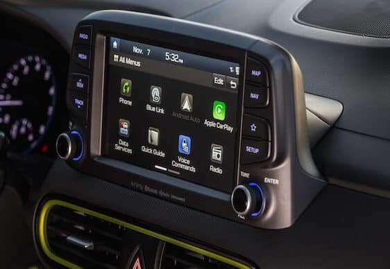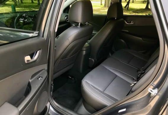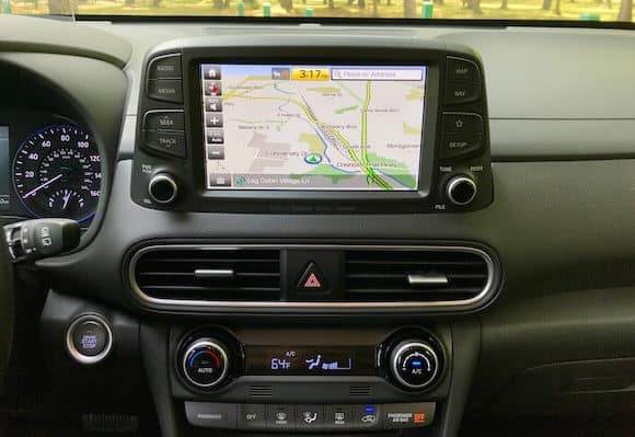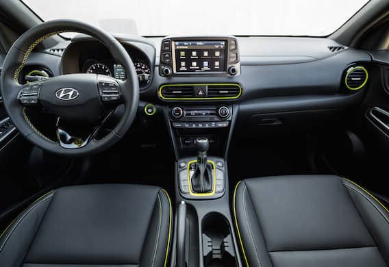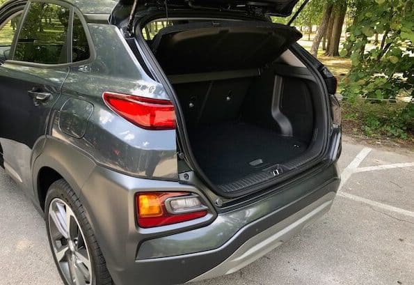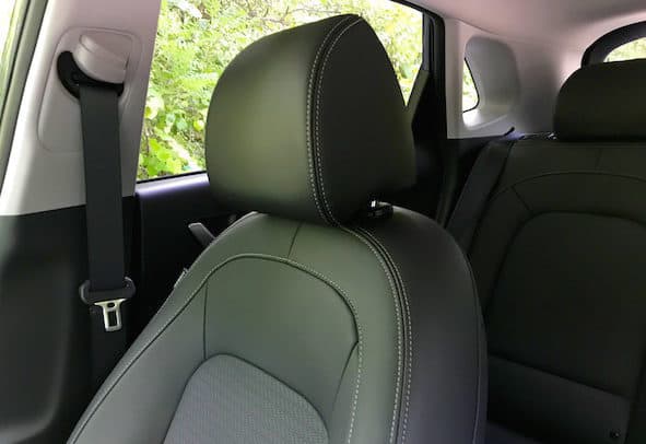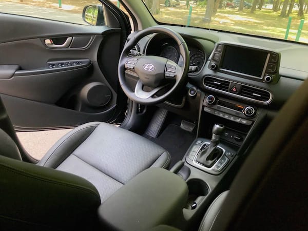 The Kona’s stylish curves and spunky personality fit right in with the segment that favors an aggressive, beefy look to counter its size. I think my tester’s subdued but respectable Thunder Gray hue muted a bit of its overall pizzazz, but more colorful options with two-tone roofs are available in the Kona’s color pallet. The Ultimate features 18-inch alloy wheels, a roof rack, and chrome-framed grille. The front ends stacked LED running lights and headlights resemble the Jeep Cherokee’s look. Open the doors and I have to say I was a little disappointed to see all the plastic my range-topping test model had for the price tag, which was just over $29K. While laid out well, the stark black interior was rather uninspiring, though you can get a lime green trim (pictured below) if you are so inclined. My model did sport leather seating surfaces, a leather-wrapped steering wheel, and gear shifter. The 8-way power adjustable driver’s seat was a highlight (the passenger seat is manually adjustable.) Designed well with some bolstering, the heated front seats get my thumbs up for comfort. Designers also did a great job with the tachometer and 4.2-inch driver display screen. A 3.5-inch screen is standard. Single-zone automatic climate control and a power sunroof come standard on the Ultimate and Limited. While shorter than some of the competition, the Kona still feels roomy enough to fit four adults comfortably. It has a 60/40 split fold-down and reclining rear seatback with 19.2 cubic-inches of cargo space with the seats up, 45.8 with them down. All trims have a dual level cargo floor.