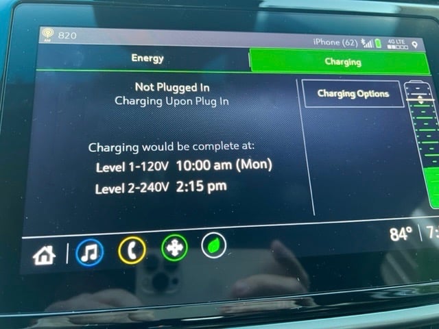 You can see a picture I took at the radio station Saturday morning at 7:50 AM. The car showed using a regular electrical plug, I would get to a full charge by Monday morning at 10 AM. With the level 2, charging would be complete at 2:15 Saturday afternoon, a little over six hours later.