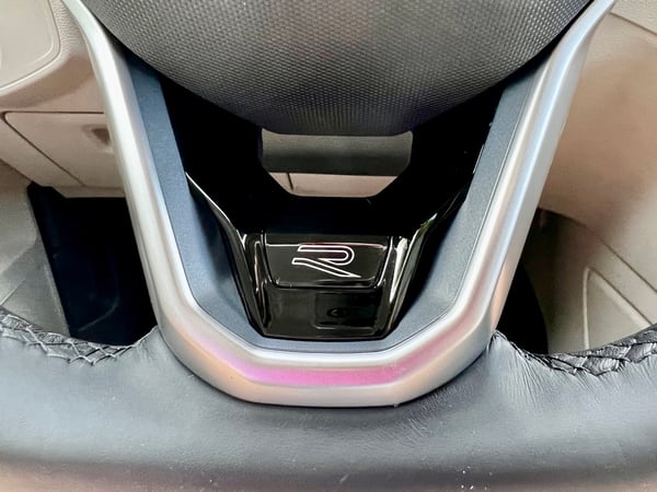 A nicely sized perforated leather-wrapped and heated multi-function steering wheel sports a cool R Line badge.