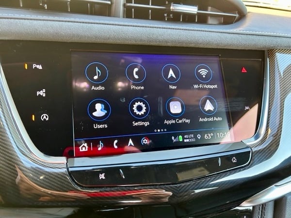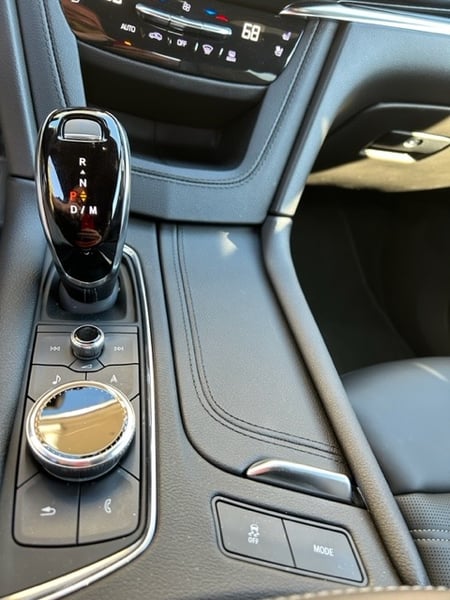 Above the shifter are the climate controls, heated and cooled front seats buttons, then just above that is the 8” color touchscreen that operates the Cadillac CUE system, which stands for Cadillac User Experience. It has been one of my favorite interface systems for years. You can use the system as a touch screen, or there is a round knob on the console if you prefer to scroll through the options. CUE offers enhanced 3D GPS navigation, Wi-Fi, and phone integration compatibility with wireless Apple CarPlay and Android Auto.