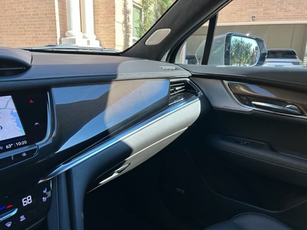 Going across the dash to both door panels, you’ll find lots of carbon fiber, which comes standard with the Sport package.