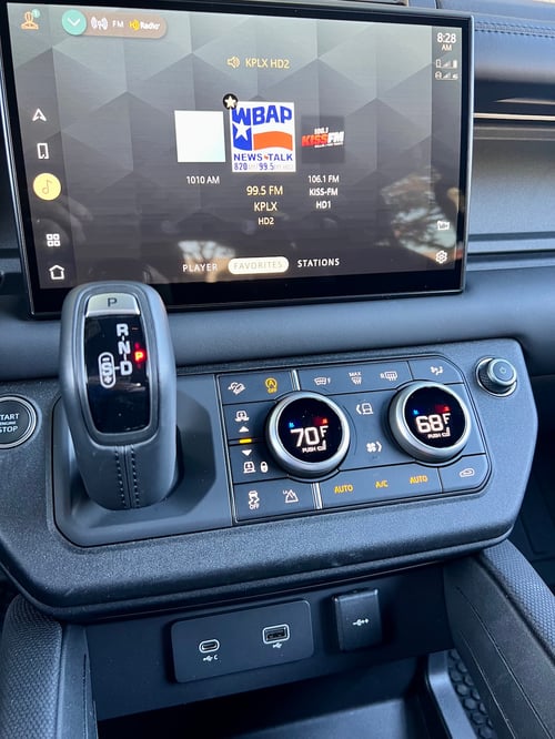 The gearshift handle is just below the screen and to the right are all the air conditioning controls, the heated and cooled seats, height control, and the button to turn off the start/stop.