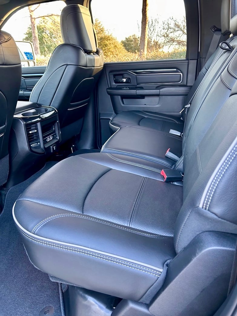 As you move to the inside, you see a huge interior that will comfortably seat five adults. There is a large center console between the front seats that slides, and one thing I love about the Ram is the way the back seat folds up to reveal in-floor storage bins that sit under the all-weather floor mats. Everything inside is soft-touch materials, and there is an abundance of stitching throughout the cabin.