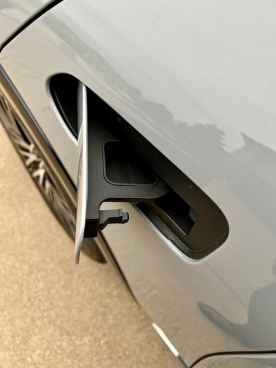 I find the exterior to be attractive, yet it is very aerodynamic. Of course, an open grill is not needed, but in a twist, the hood does not open. 21” wheels really set off the Alpine Grey exterior. There is a small door on the left front fender that confused me for a moment. It is where you add windshield wiper fluid since the hood doesn’t open. The door handles pop out when you approach the vehicle.