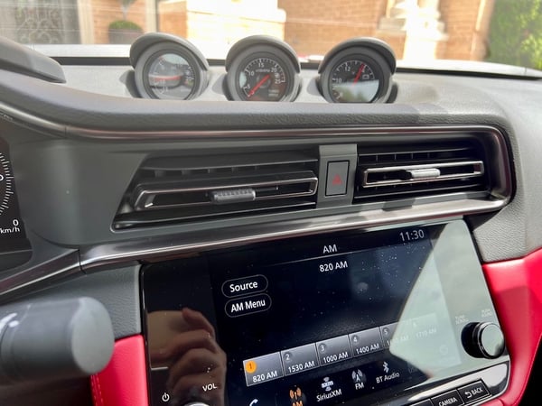 Upper dash, you get a 9” touchscreen that operates the Bluetooth, an information screen, audio, a menu button, navigation, and a button for connections. The system works well and is quick to go between functions. The info screen gives you a ton of real-time info from weather, to sports scores, to stock prices, movie listings, and more. Above the touchscreen, I love that there are three analog gauges that are angled toward the driver.