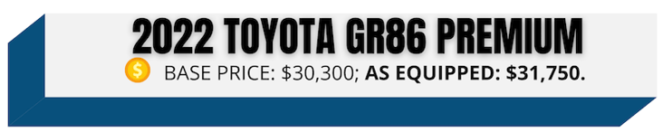 GR stands for Toyota's Gazoo Racing team. The 2022 GR86 is a two-trim lineup. My test vehicle is the range-topping Premium model with the 6-speed manual transmission, although an automatic is also available.