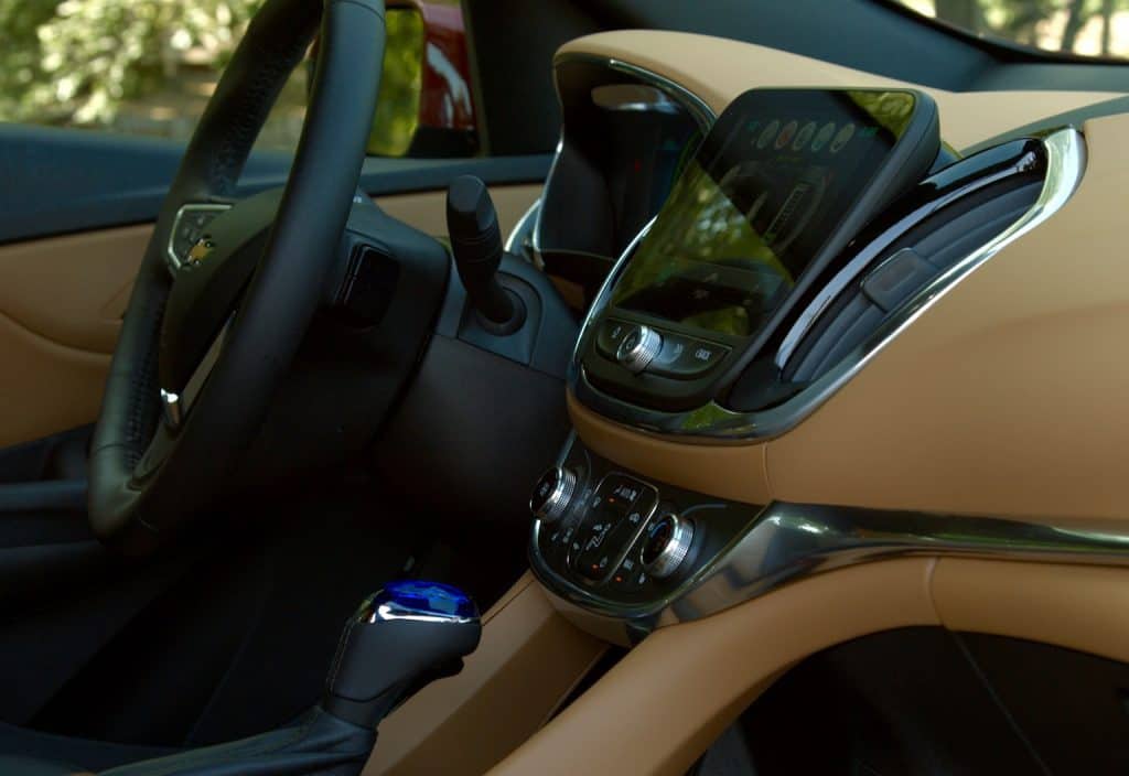 I was surprised when I got in the Volt to see the contemporary, two-tone interior. There are only two trim levels, the LT and the Premier. This one is the Premier, so it comes with leather seats that are very comfortable. The dash is colorful and high tech. In the middle of the gauges, you can use the steering wheel controls to gather all sorts of information.