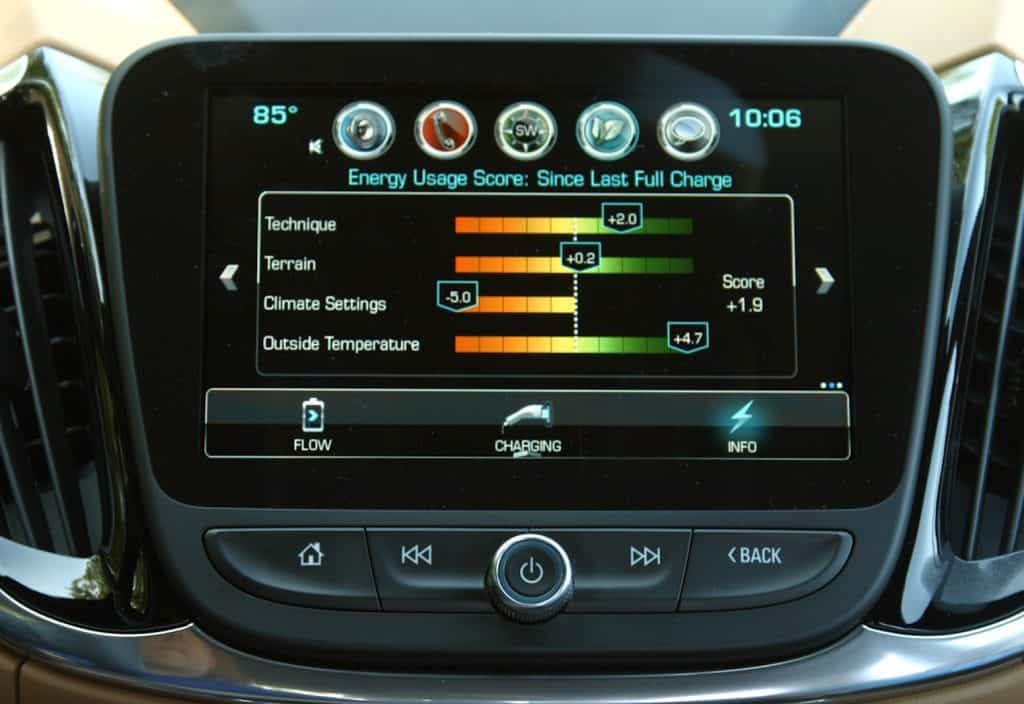 Above that is an 8” Chevy MyLink touchscreen that holds all the apps and allows you to operate the Bose stereo, the Apple and Android interfaces, navigation system, 4G LTE hotspot (that will operate 7 different devices), and real-time traffic info. One screen gives you all the info on whether you are running on all battery, all gas, or a combination.