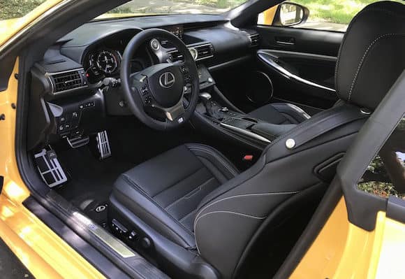 A rear back up camera is standard on all RC 300s, as is a 10-way power driver's seat, illuminated door handles, carpet floor mats, a tire pressure monitoring system and smart access with push-button start/stop. Added options on my test model include the $4,105 F Sport package with its performance and visual upgrades, along with the $2,725 Mark Levinson/Navigation package and a $1,100 power moonroof.