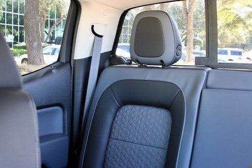The jet black interior of the Colorado Z71 isn’t terribly fancy, with no shortage of plastic surfaces, but it’s comfortable and succeeds in being somewhat stylish thanks to its two-tone cloth and leatherette seats along with some silver blue accents on the center stack. Chrome adorns the inside door handles. Heated front bucket seats are power adjustable with lumbar support as well. The crew cab is roomy in front and back, but be warned, the rear bench seat is pretty upright (ahem, not that comfortable), perhaps to discourage slouching.