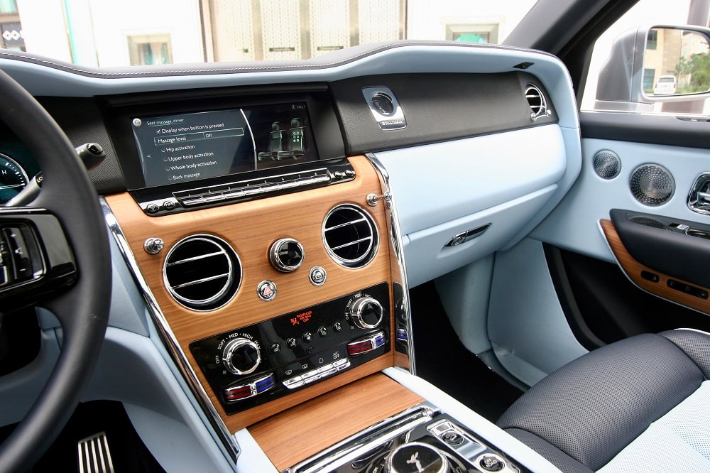 The Cullinan’s Bespoke interior is an incredibly quiet oasis from the outside world. It envelopes you in comfort and surrounds you with soft leather and polished hardware and switchgear. The model with the Launch package features a two-tone Signature scheme leather interior with two blues, a Charles Blue and a darker Navy Blue along with open pore wood walnut trim. The Selby Grey contrast stitching on the dash and elsewhere is, of course, impeccable.