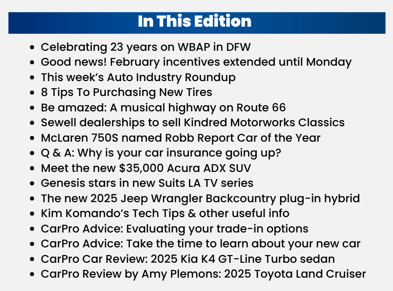 When you wake up in the morning, besides tuning in the Car Pro Radio Show, it will say March when you turn your calendar. Warmer weather can’t be far behind, right? Just a quick thank you to all those who came by to see us at last Saturday’s DFW Auto Expo that marked the 15th straight year of broadcasting from there. Speaking of milestones, tomorrow marks the start of the 24th consecutive year of the Car Pro Show on WBAP radio in DFW.