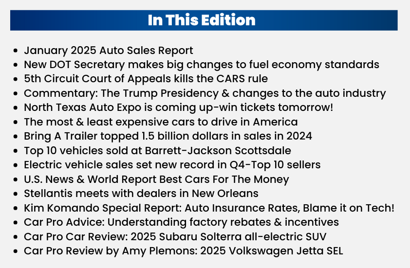 We kick off with the sales report for January 2025 from the car companies that report monthly. Then we look at the changes to the auto industry under President Donald Trump. In one article, there are big changes coming to fuel economy standards. Then I have a commentary piece I wrote that concurs with insights from Cox Automotive on other big changes to the auto industry we might see. In other pressing matters, I told you about the CARS Rules, which was initiated by the Federal Trade Commission to stem deceptive practices by car dealers. It has been challenged and it has been struck down by the courts, at least for now.
