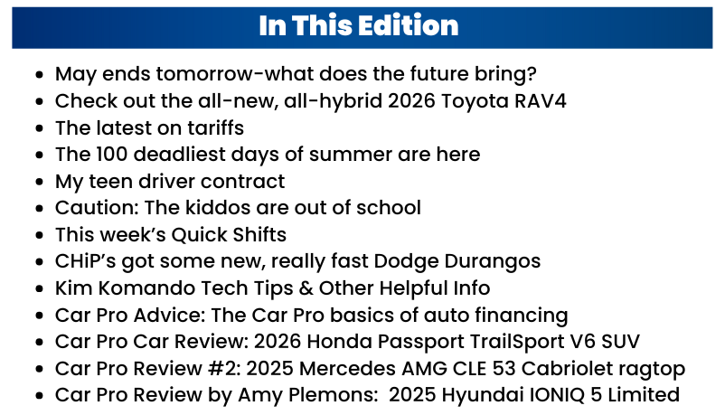 The long-awaited details on the all-new 2026 Toyota RAV4 are available for you below, and it’s a beauty. The 100 Deadliest Days of Summer just started and you should pay close attention to that. If you have a teen driver, I offer up my teen driver contract that through the years thousands of people have used. And if you plan to speed in California, be aware the CHP has some hot and very fast vehicles to catch you with - and you won't even see them coming!